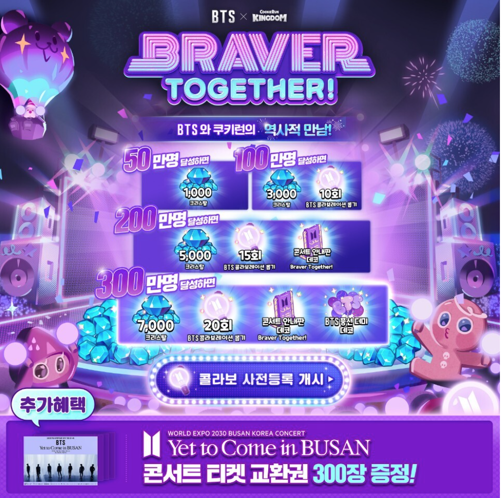 이번 협업의 슬로건인 '브레이버 투게더'(Braver Together)는 쿠키런 프랜차이즈만의 가치인 '용기', BTS와 팬 사이의 애틋한 관계를 뜻하는 '함께'의 가치를 담았다고 해요.