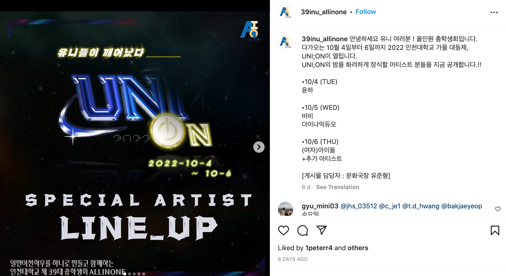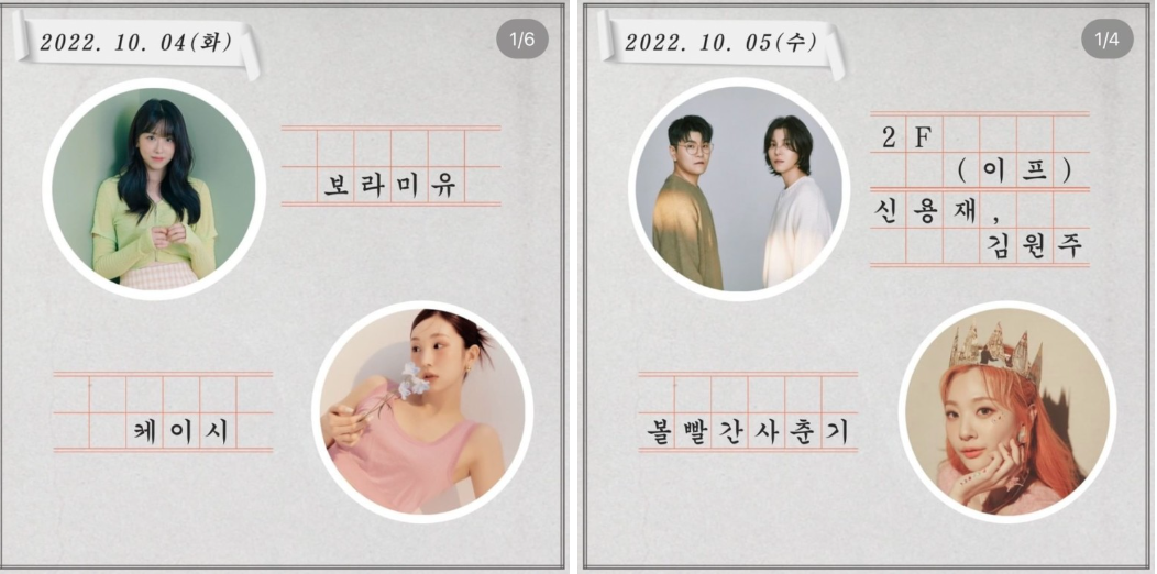• 10월 7일 : 비와이 & 해양경찰관현악단, 소수빈, 10cm, 스테이씨, 실리카겔, 이유카